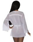 From the Exposed by Magic Silk collection, this style includes: a thigh length robe featuring breathable mesh, lace across the shoulders, flowy bell style full-length side slit sleeves, a rutched accent in the back, and an attached silky ribbon tie waist.