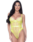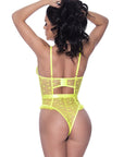 From the Exposed by Magic Silk collection, this style includes: a teddy featuring star designs, elastic adjustable shoulder straps with neon chartreuse sliders, hook and eye closure in the back, an open cut-out in the back, boning in the front, a high cut design in the hips with ruffle details, and a snap crotch.