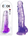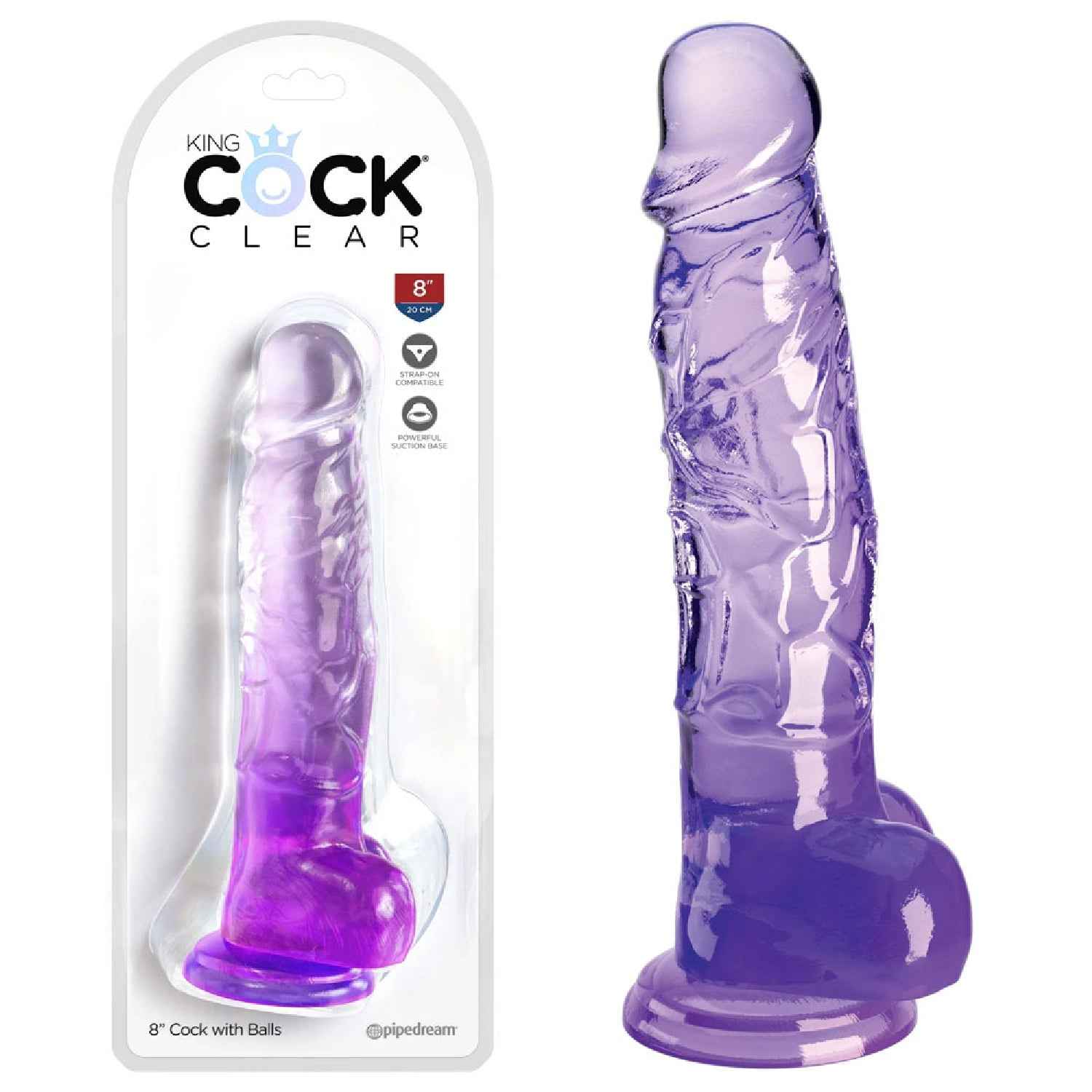 Introducing the King Cock Clear 8'' Cock with Balls in a stunning purple hue. This 20.3 cm dong is designed to elevate your pleasure experience with its realistic form and translucent material.