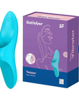 Introducing the Satisfyer Teaser, a light blue USB rechargeable finger stimulator designed for ultimate pleasure. This small, versatile vibrator features a convenient finger loop, making it easy for anyone to use and explore their erogenous zones.